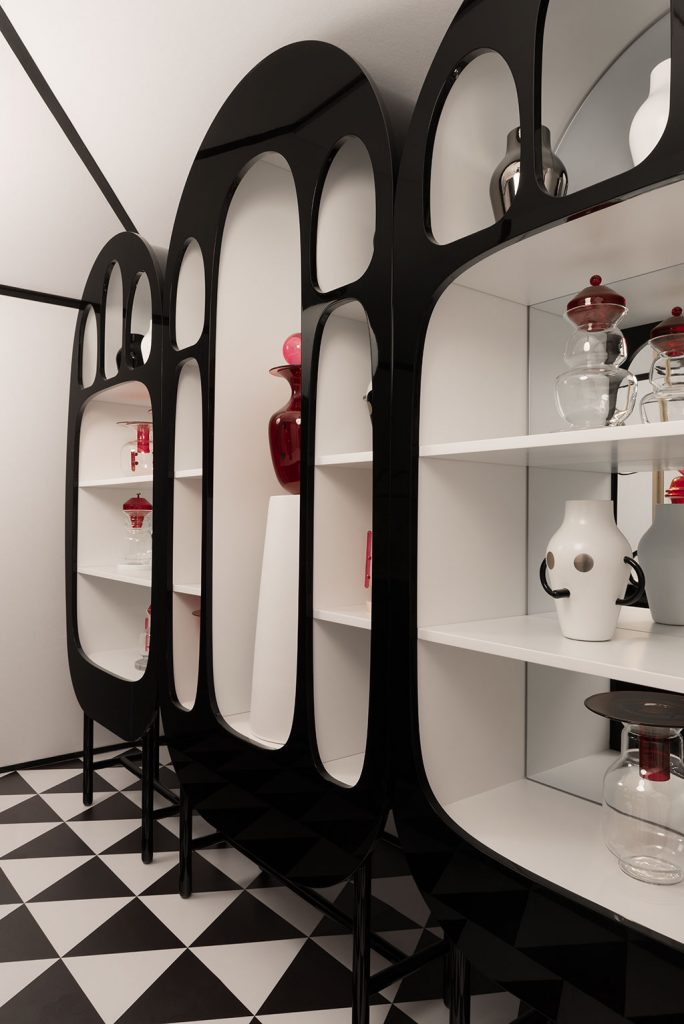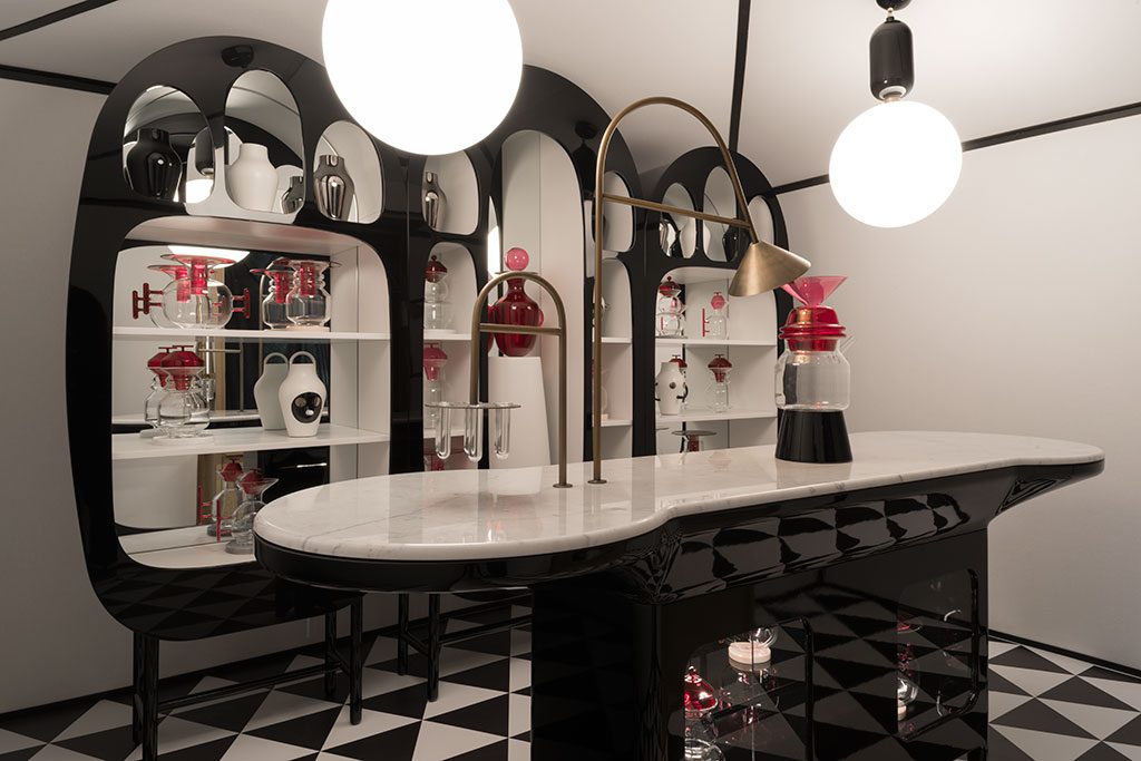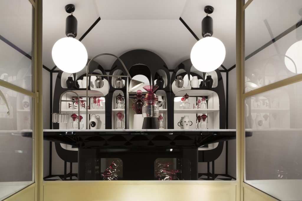 Noble materials such as glass, ceramic, and leather, are mixed in an explosion of forms. By day, it’s a glimmering mix of materiality and wonder, and by night, it lights up into a sparkling dream world.”