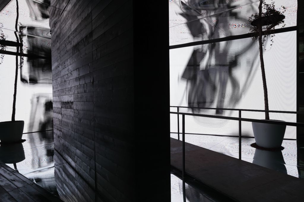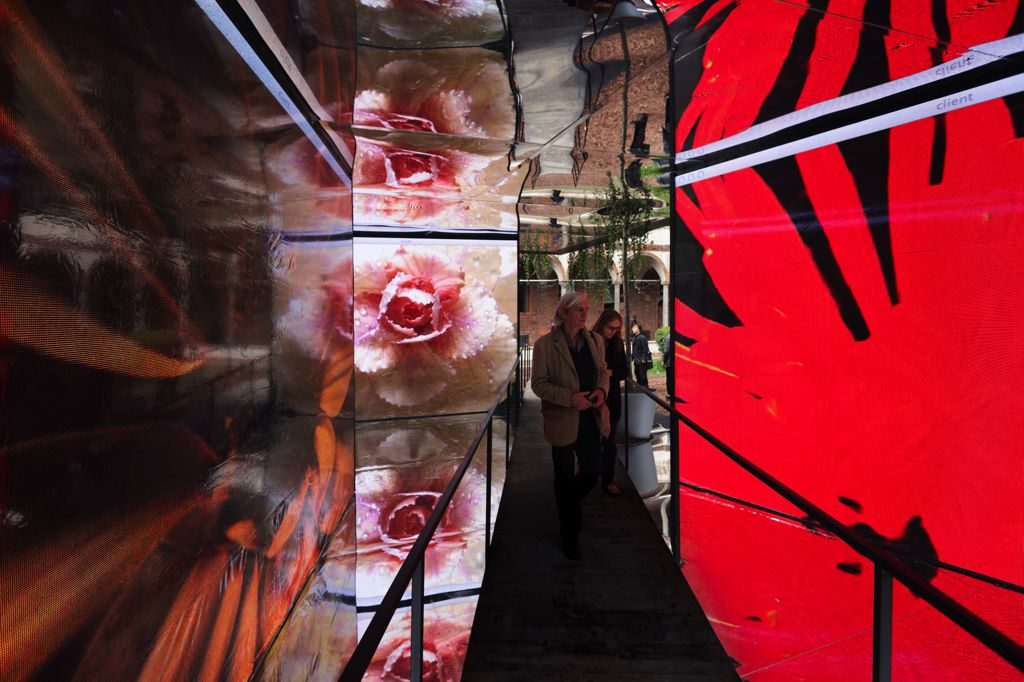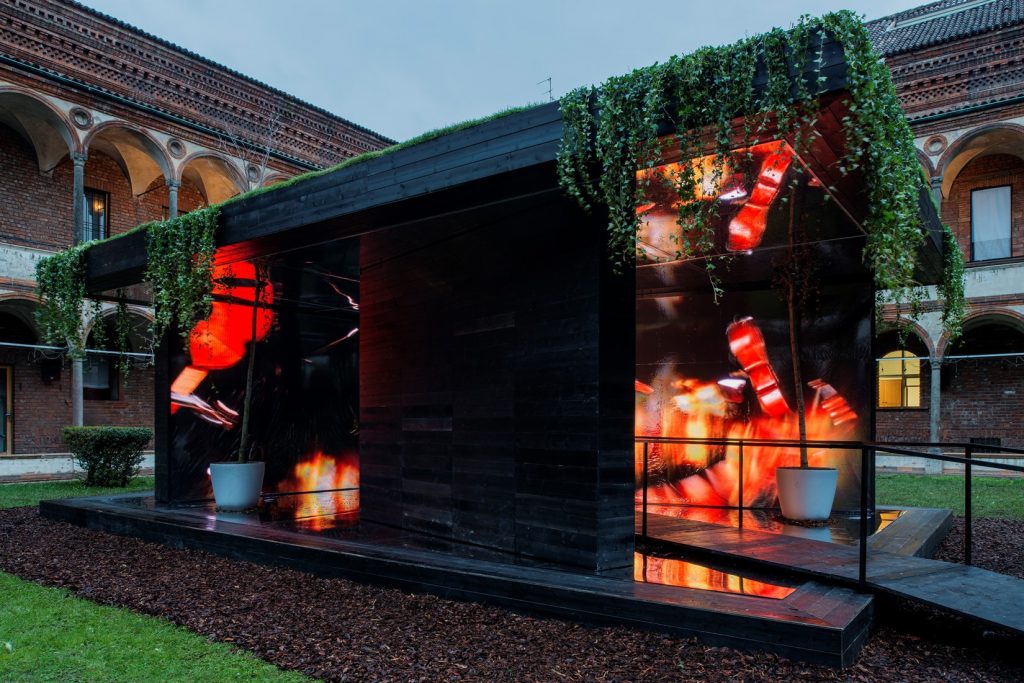 ‘The House of Senses’ appeared as a simple shelter, with exterior surfaces a play of anthracite wood, sod and vines, while inside, a spectacle loop by video artists from Studio Azzurro inhabited the walls with an epiphany of moving pictures and designs that would suggest early surrealist cinema, and the stream of consciousness rhythms that are so prevalent in our daily co-existence with electronic devices.