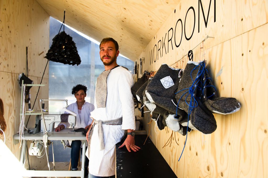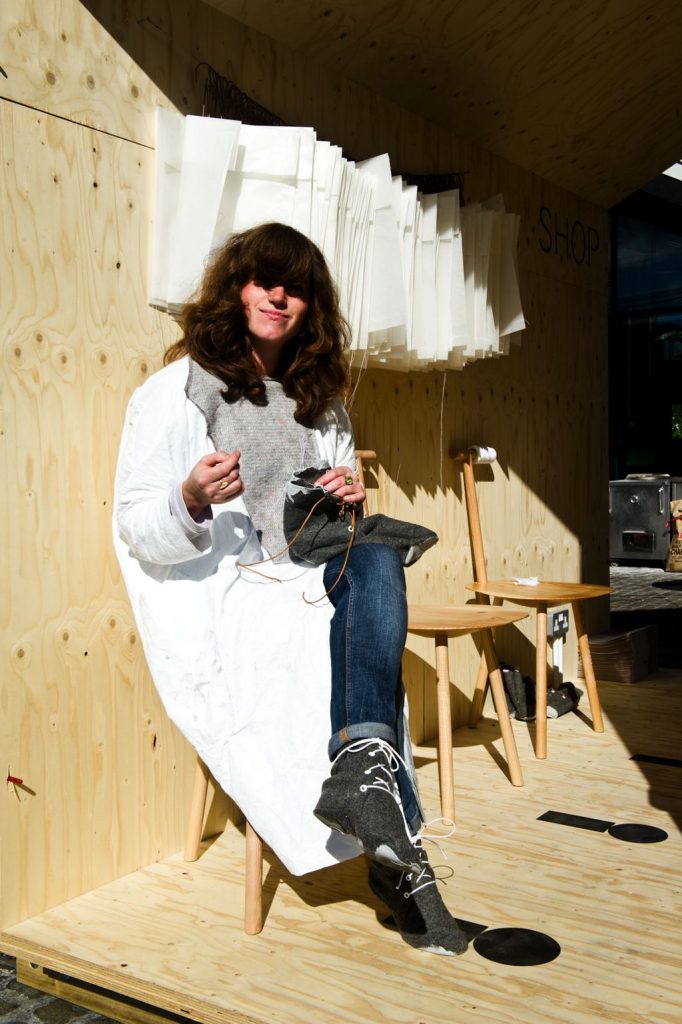 At one hut, Faye Toogood and her Studio Toogood design team rolled out an industrial overlocker and donned aprons to create cheap, cheerful ski chalet-friendly high-top slippers from recycled cloth.